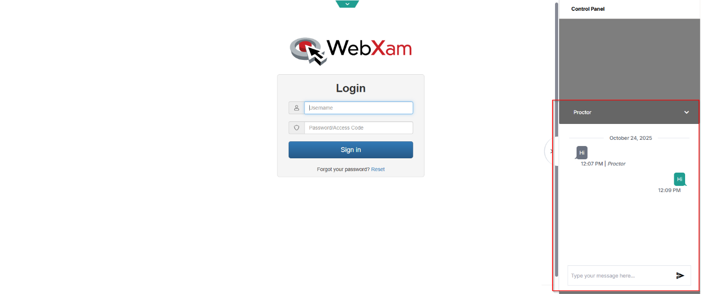 Click on the chat bar at the bottom of the control panel to open the chat box and drop a message to the proctor if any assistance is required.