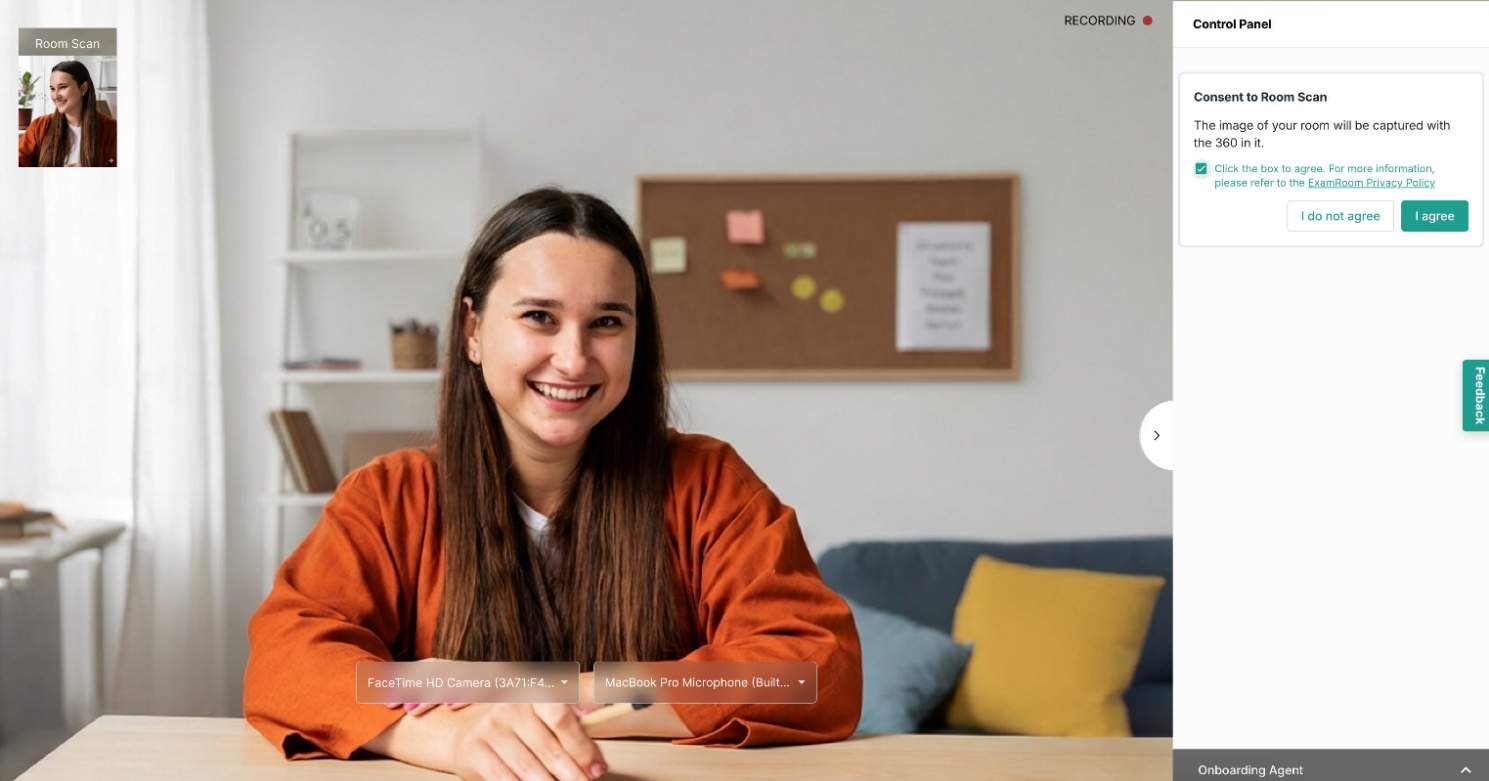Now, to begin the process of Room Scan, the OBA triggers a QR Code display on your screen for you to scan and open the app on your phone, and place your phone as suggested by the OBA so they can see your entire testing area, including your computer.
