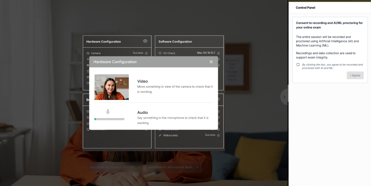After clicking StartExam, the system automatically checks your device readiness by verifying your hardware, software, browser, and network configurations.