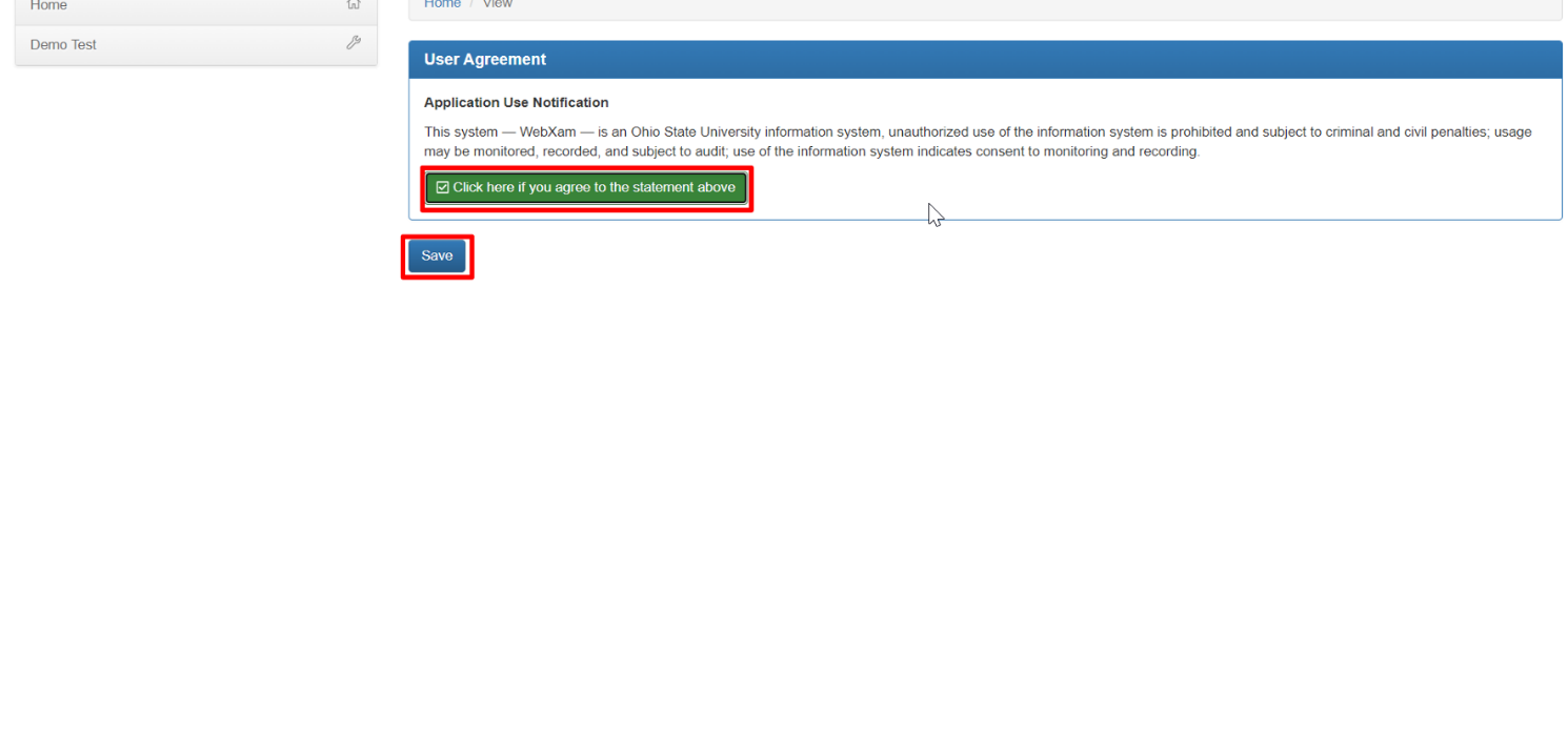 Read the UserAgreement notification and select the Checkbox (Click here if you agree to the statement above) and click Save to continue.