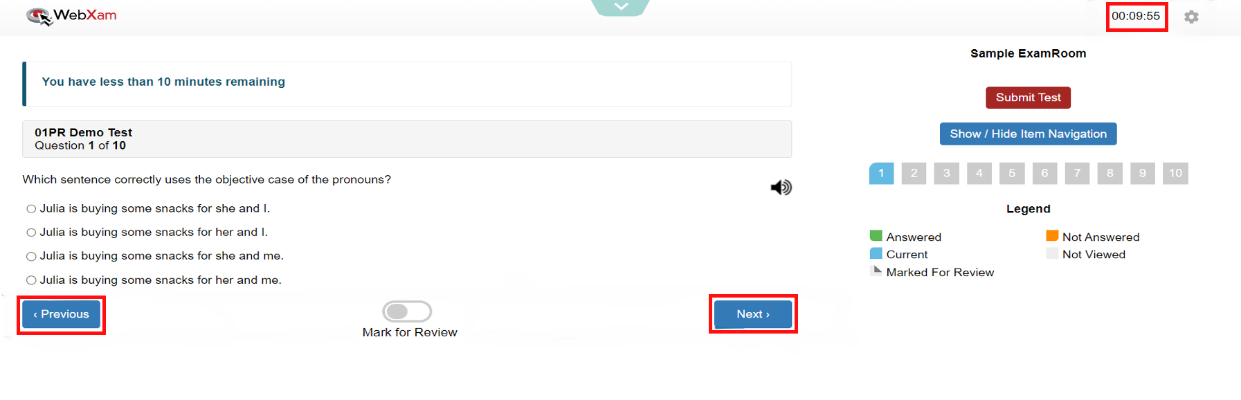 Use the question navigation buttons (Next and Previous) to move between questions, and you may also check the status of each question (answered, not answered, or marked for review).