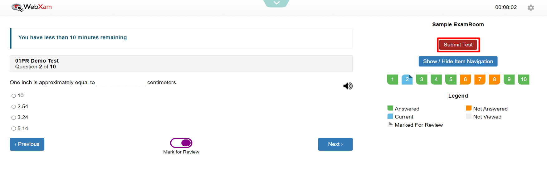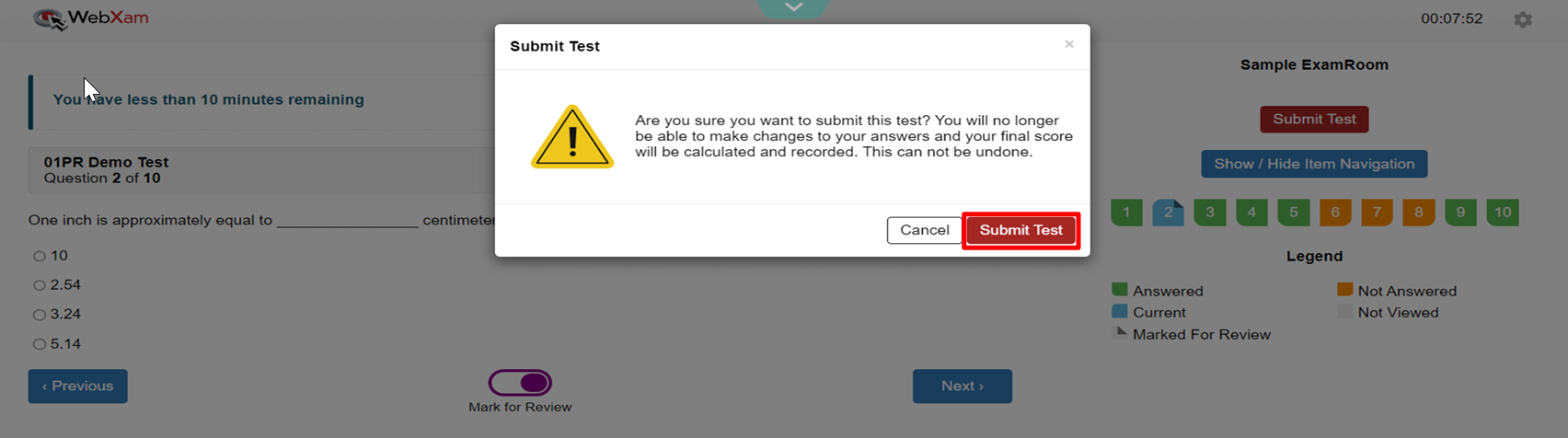 When you click Submit, a pop-up will notify you that the test will end immediately upon submission. Make sure to answer all questions before submitting. Click Submittest to submit your exam answers.